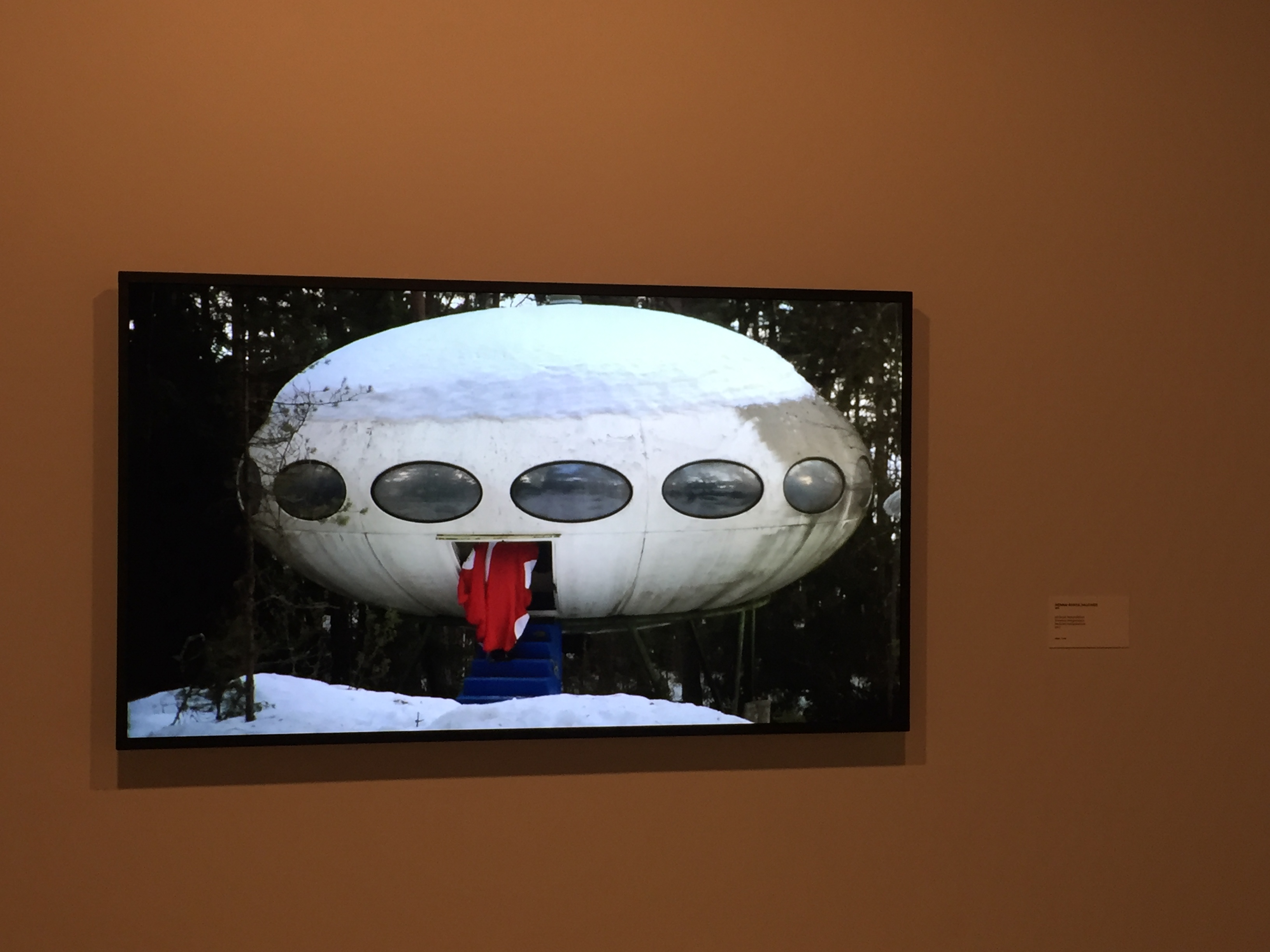 Arkkitehti Matti Suurosen vuonna 1968 suunnittelemasta Futuro-talosta kertova näyttely sisälsi myös vienninedistämisvideon. Kuvassa Marimekko-mekon helma juuri häviää Futuro-taloon.